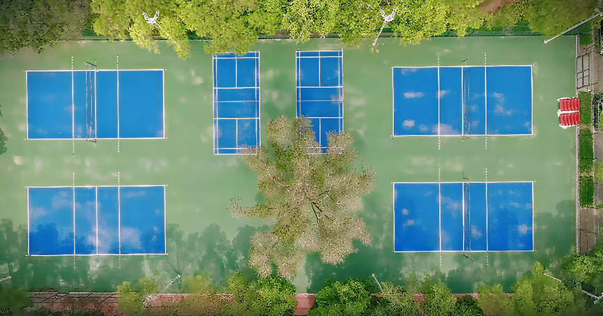 俯瞰之下,整治后的场地规整如矩,初秋的阳光洒在硅PU面层上,绿色与湛蓝交织出柔和光泽;四片标准排球场并肩铺展,两片羽毛球场地被巧妙嵌入其间,线条利落,互不干扰;4米高的浸塑围网环绕四周,墨绿色调与楼宇、行道树相映成趣,既开阔视野,又确保安全;田径场侧新开人行便门,径直通向13号学生公寓,师生往来更为便捷;长轴之上,8座高杆灯对称而立,夜间照度均匀,智能模块可按区域、时段调光,在保障使用的同时实现节能;10组塑木长凳在林荫下均匀排布,休憩之所与景观节点自然融为一体。